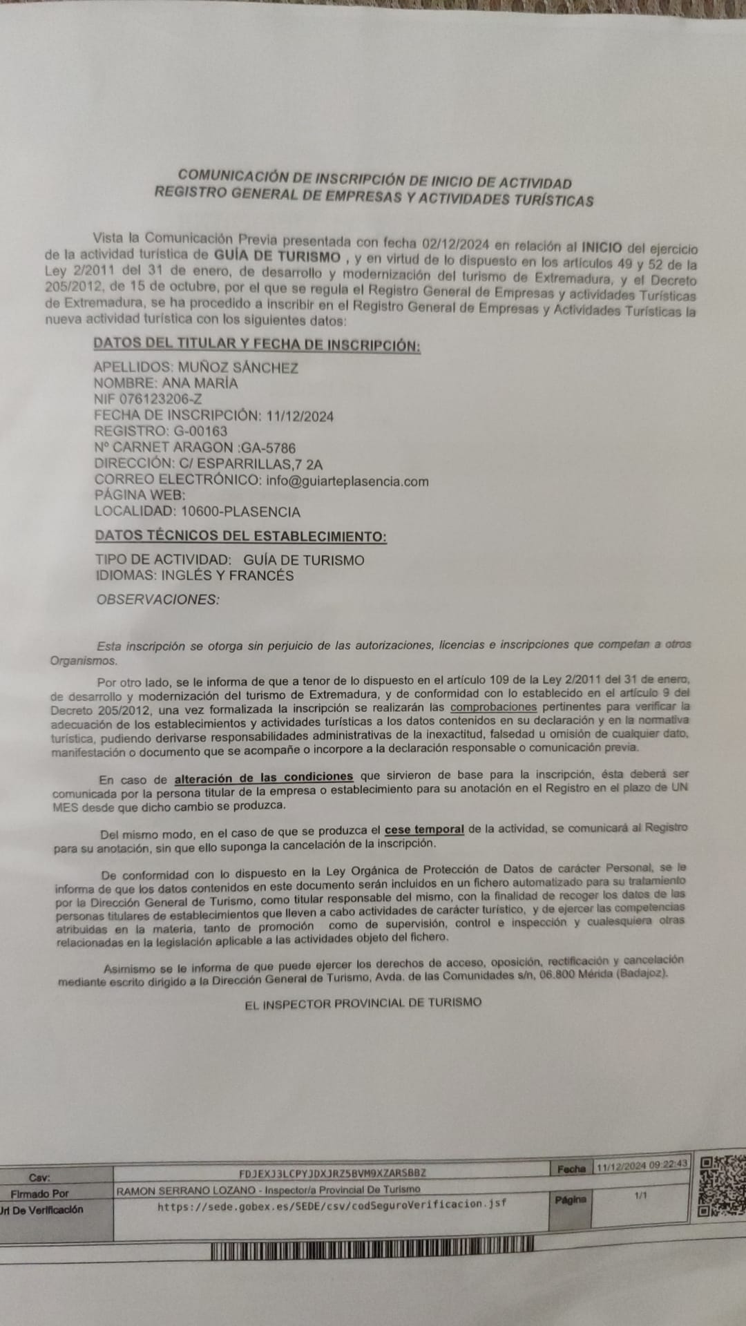 CALLE ESPARRILLAS, 7 2A PLASENCIA. 654376108 anamsguia@gmail.com Año adhesion: 2025 / Estado: Distinguido / Guías de turismo